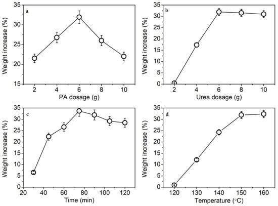 Weight increase percentage of KF at various PA dosages (a), urea dosages (b), reaction times (c), and reaction temperatures (d).