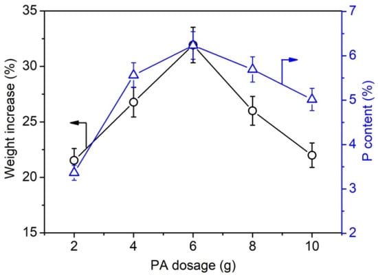 Weight increase percentage and phosphorus content of phosphorylated KF samples prepared using various dosages of PA (PA 2–6 g, urea 6 g, 150 °C, and 90 min).