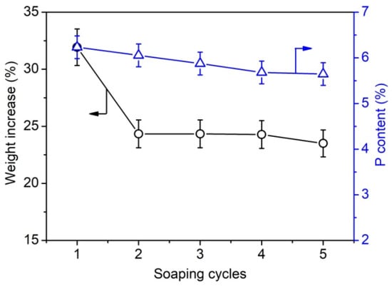 Weight increase percentage and phosphorus content of phosphorylated KF sample prepared using 6 g PA and 6 g urea at 150 °C for 90 min after different cycles of soaping.