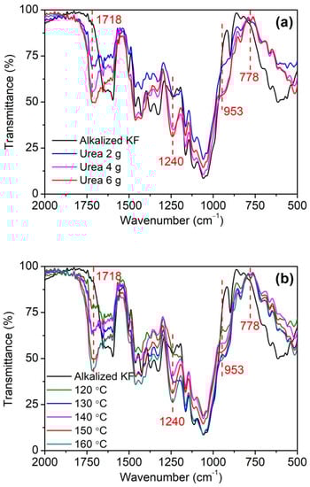 FT-IR spectra of alkalized KF and phosphorylated KF samples obtained at various urea dosages (PA 6 g, urea 2, 4, and 6 g, 150 °C, and 90 min) (a) and various temperatures (PA 6 g, urea 6 g, 120, 130, 140, 150, and 160 °C, and 90 min) (b).