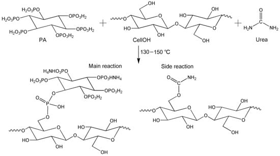 As can be seen in Figure 4, phosphorylated KF displayed three new peaks at 1718, 953, and 778 cm−1 compared with alkali-treated KF. The peak at 1718 cm−1 is the stretching vibration of C=O, which may be caused by the reaction product of urea and cellulose []. During the heating, urea decomposes to form isocyanic acid, which reacts with the hydroxyl group of cellulose to form a carbamate group []. In addition, the intensity of this peak gradually increased with increasing urea dosage (Figure 4a), indicating that urea participates in the reaction during the phosphorylation of cellulose. Furthermore, this peak also showed an increasing intensity with increasing temperature (Figure 4b), which is related to the increased degree of esterification of cellulose []. The peaks at 778 and 953 cm−1 correspond to P-O-C and P-OH, respectively [,]. Compared with alkalized KF, phosphorylated KF displayed an obvious peak at 1240 cm−1 with increasing intensity as urea dosage and temperature increased, which corresponded to P=O [,]. These peaks mentioned above demonstrate the linkage of the phosphate groups of PA onto cellulose. The schematic diagram of the phosphorylation of KF with PA in the presence of urea is presented in Figure 5.