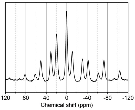 In the 31P-NMR spectrum of phosphorylated KF (Figure 6), the main 31P signal appeared at 0.459 ppm, which is typical for phosphate ester bound to cellulose []. The presence of this signal demonstrates the grafting of PA onto cellulose. The signal at 20.033 ppm indicates the presence of phosphonates []. The signal at −11.101 ppm is assigned to polyphosphates which arise from the partial condensation of phosphate groups of PA present in KF during the heating step [,,]. Moreover, other peaks at high chemical shift positions are rotational sidebands due to powder anisotropy [,,].