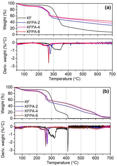 The TG and DTG (differential thermogravimetric) curves for raw and phosphorylated KF samples in nitrogen and air are shown in Figure 7, and the partial TG data are summarized in Table 1. In the nitrogen atmosphere, raw KF underwent two main weight loss stages. The first stage occurred in the temperature range of 280–360 °C with a maximum degradation rate temperature of 344.6 °C, which is due to the depolymerization of cellulose to form levoglucose and further decomposition []. The second stage occurred above 360 °C, during which the above degraded products further crack into low weight products and char. Compared with raw KF, phosphylated KF samples displayed lower onset degradation temperature (To), end degradation temperature (Te), and temperature at the maximum degradation rate (Tmax), as well as much higher residual weights at Tmax, Te, 500 °C, and 700 °C, as shown in Table 1. Moreover, these residual weights increased with increasing PA dosages used in the phosphorylation reaction. These results indicate that phosphorylated KF samples degrade rapidly at lower temperatures, and their pyrolysis products have better thermal stability. These phenomena are associated with the fact that PA grafted onto cellulose is thermally degraded to produce phosphoric acid, which catalyzes the hydrolysis and charring of cellulose [,,].