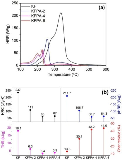 In the PCFC technique, phosphorylated KF samples were first subjected to thermal degradation, and then, the fuel gases released from the degraded products were mixed with oxygen, and their flammability parameters were measured. As shown in Figure 8, phosphorylated KF samples showed much lower temperatures at the maximum heat release rate (Tmax), peak heat release rate (pHRR), heat release capacity (HRC), and total heat release (THR) of phosphorylated KF samples than raw KF. Moreover, phosphorylated KF samples showed much more char residues, which is consistent with the TG data. In the PCFC analysis, the lower Tmax and more char residues of phosphorylated KF samples are also attributable to the hydrolysis and charring of cellulose caused by the acidic degraded products of PA. Additionally, Figure 8 shows that the phosphorylated KF samples prepared using 4 and 6 g of PA had lower pHRR, HRC, and THR values, and higher residual char quantities than the sample obtained using 2 g of PA. The PCFC analysis reveals that phosphorylated KF samples possess good charring ability in the process of thermal decomposition, and their degraded products exhibit low heat release behavior. Therefore, phosphorylated KF samples are good flame-resistant materials.