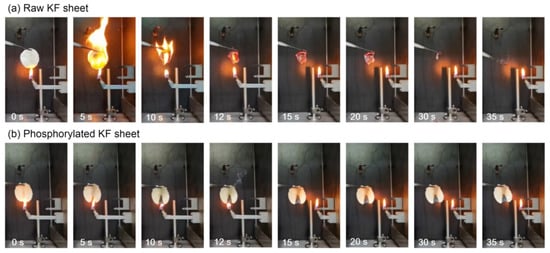 Flammability test of raw KF sheet (a) and phosphylated KF sheet obtained using 6 g PA (b).