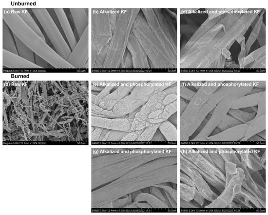 SEM micrographs of raw, alkalized, and phosphorylated KF sheets before and after combustion: Sheet samples: (a,d–g) and loose fiber samples: (b,c,h); (e,f) were collected from two sides of residual char in the middle of burned KF sheet; g was collected from the upper residual char of burned KF sheet; phosphorylated KF sample was obtained using 6 g PA.