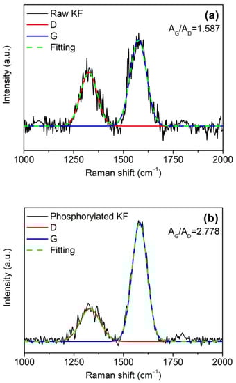 In the combustion process, the graphitization of polymers usually occurs. Therefore, Raman spectroscopy was used to evaluate the graphitization extent of the char residues of raw and phosphorylated KFs in order to provide further evidence for the enhanced charring ability of phosphorylated KF. In Figure 11, the Raman spectra of raw and phosphorylated KF showed two peaks at 1335 cm−l (D-band) and 1580 cm−l (G-band), which are assigned to the disordered or amorphous carbon and graphitized carbon, respectively [,]. The integrated peak area ratio of G to D bands (AG/AD) can characterize the graphitization extent of carbonaceous materials. Phosphorylated KF residue exhibited a graphitization extent than raw KF residue. This result indicates that phosphorylated KF yields more graphitic char during the combustion, which is very helpful in improving the flame retardancy of KF.