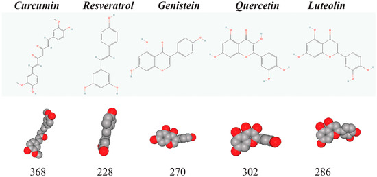 Chemical structures of curcumin, resveratrol, genistein, quercetin, and luteolin. This figure shows chemical structures (top row), space-filling models (medium row), and exact mass (bottom row) of curcumin, resveratrol, genistein, quercetin, and luteolin. Curcumin is a diarylheptanoid from the group of curcuminoids, while resveratrol is a 3,4′,5-trihydroxy-trans-stilbene. Genistein, quercetin, and luteolin are flavonoids derived from a 15-carbon skeleton with two aromatic phenyl rings (A and B). Flavonoids also contain a heterocyclic pyran ring (C) with an embedded oxygen. These are small molecules—with molecular weight between 228 and 368—that are aromatic. For example, curcumin and resveratrol contain two aromatic phenyl rings. Note that such natural phenols are chemically active in many types of organic reactions that are common in a living cell, such as free radical chemistry, nucleophilic addition, or metal ion interactions [8].