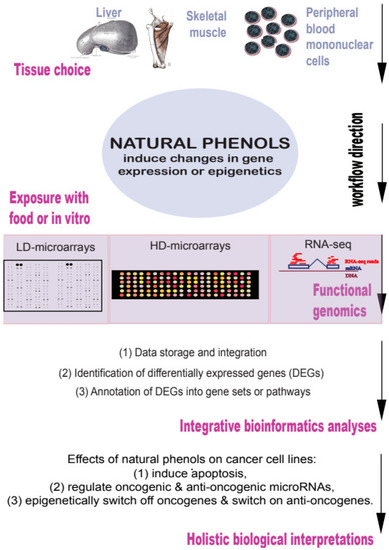 It is thus clear that many enzymes and signaling proteins are direct biochemical targets of natural phenols [20,21,22,23]. However, I concentrate herein on the interpretation of transcriptional changes induced by the natural phenols [24,25,26,27]. I argue that gene expression changes induced by natural phenols can be studied using integrative approaches such as functional genomics and bioinformatics (Figure 2).