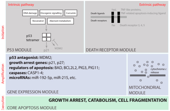 A circuit board for initiation, amplification, and execution of apoptosis. Apoptosis is initiated through either a p53-dependent (intrinsic) or independent (extrinsic) pathway. The intrinsic apoptosis pathway is p53-dependent [34] and is initiated by pathological internal cellular states such as DNA damage or aberrant metabolism. Cyclin-dependent kinase inhibitor 1—p21 [35] and cyclin-dependent kinase inhibitor—p27 [36] are key inhibitors of the cell cycle that is transcriptionally induced by p53. Interestingly, mutated p53 is frequently stabilized by mutations rather than depleted in cancer cells [37]. This is because normal p53 functions within a dynamic cycle of production and degradation known as the futile cycle. Indeed, mutated p53 forms lack normal transcriptional activity and fail to transcriptionally induce MDM2—a protein that induces rapid p53 ubiquitination [38].