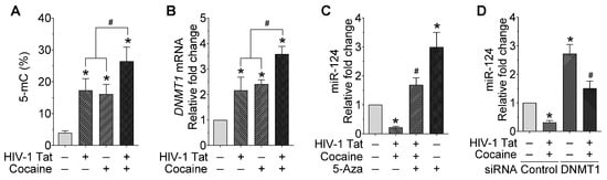 Similarly, the psychostimulant drug cocaine has also been reported to alter CNS functions in vitro and in vivo [,,,,,,,,,,,,,,]. It is also well-known that HIV-1 Tat and cocaine cause neuronal dysfunction and are involved in HIV-associated neurocognitive disorder (HAND) [,,,,,,]. People living with HIV-1 (PLWH) who abuse cocaine have exhibited the synergistic potentiation of viral replication and disease progression, in contrast with PLWH who do not use cocaine or HIV-1 negative cocaine users []. It is also well-known that neuroinflammation is an essential correlate of HAND pathogenesis in HIV-1-infected individuals []. Moreover, the increased production of proinflammatory cytokines by the activated microglia is also associated with cognition, memory and learning, and sensory functions in HAND patients with drug abuse [,,,]. Studies have also shown that HIV-1/HIV-1 Tat infection potentiates alterations in DNA methylation machinery, particularly the induction of DNMT1 expression and MeCP2/STAT3-mediated neuroinflammation [,]. Cocaine exposure in mice also elevates DNA methylation enzymes and MeCP2 binding, which decreases gene expression patterns in the nucleus accumbens []. Furthermore, cocaine exposure activates the mouse microglia via KLF4/TLR4 signaling axis both in vitro and in vivo []. These studies also signify the role of miR-124, a brain-enriched miRNA that plays a critical role in microglial quiescence and neuronal homeostasis [,,]. In this study, we hypothesized that the exposure of mouse primary microglia to both HIV-1 Tat and cocaine could result in intensified microglial activation via the promoter DNA hypermethylation of miR-124, leading to the exacerbated release of proinflammatory cytokines, ultimately culminating in neuroinflammation.