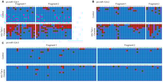 HIV-1 Tat and cocaine significantly increased the DNA methylation levels in primary miR-124-1 and -2, in microglia. Promoter DNA methylation of pri-miR-124-1 (A), prim-miR-124-2 (B), and pri-miR-1244-3 (C), using bisulfite-converted genomic DNA sequencing in HIV-1 Tat (25 ng/mL)- and cocaine (10 μM)-exposed mouse primary microglial cells. The promoter methylation status of sequenced data was analyzed using default threshold settings by BISMA software (http://services.ibc.uni-stuttgart.de/BDPC/BISMA, accessed on 25 July 2021).