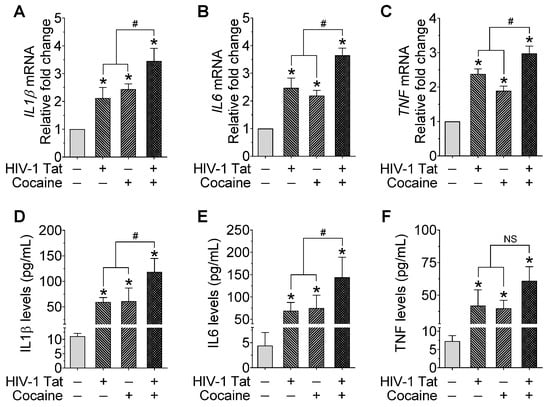 HIV-1 Tat and/or cocaine significantly increased the proinflammatory cytokines in microglia. Representative qPCR analysis showing the expression of IL1β (A), IL6 (B), and TNF (C) mRNA in HIV-1 Tat (25 ng/mL) and cocaine (10 μM) exposed mouse primary microglial cells for 24 h. Quantification of IL1β (D), IL6 (E), and TNF (F) levels using ELISA in HIV-1 Tat (25 ng/mL) and cocaine (10 μM) exposed mouse primary microglial cells for 24 h. Data are mean ± SEM from six independent experiments. Nonparametric Kruskal–Wallis one-way ANOVA followed by Dunn’s post hoc test was used to determine the statistical significance of multiple groups. * p < 0.05 versus control; # p < 0.05 versus HIV-1 Tat or cocaine; NS, Not significant.