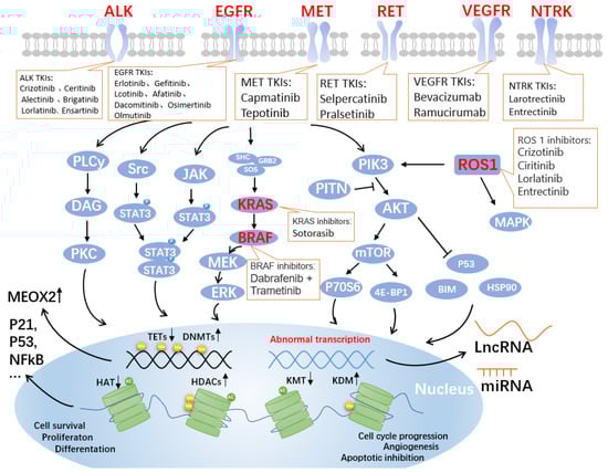 Genes and pathways associated with targeted drugs for NSCLC. Four critical signaling pathways include JAK-STAT, MAPK, PLC-gamma (phospho-lipase C gamma), and PI3K-AKT. These pathways are well-known controllers of cell cycle progression, proliferation, and apoptosis/cell survival; deregulation is a frequent characteristic of human malignancies. Alterations in key pathways will affect DNA methylation modifications, such as increased DNA methyltransferases (DNMTs) and decreased the ten-eleven translocation methylcytosine dioxygenases (TETs), further allowing overexpression of mesenchymal homology box 2 (MEOX2), whose expression is negatively correlated with patient survival. Additionally, post-translational histone modifications were affected. As shown in the figure, histone acetyltransferases (HATs), histone deacetylases (HDACs, also known as lysine deacetylases or KDACs), the lysine methyltransferases (KMTs) and lysine demethylases (KDMs) undergo corresponding up- or downregulation, affecting the expression of P21, P53, nuclear factor κB (NFκB), and other related proteins that are closely related to the cell cycle. Non-coding RNAs, such as long non-coding RNAs (LncRNAs) and miRNAs, are produced as a result of abnormal transcription. The lncRNA is a brand-new class of regulatory RNA. The LncRNA HOX antisense intergenic RNA (HOTAIR), an oncogene in NSCLC, is one of the significant factors controlling the growth of malignancies. Unknown are the immunomodulatory pathway and probable molecular mechanism involved in NSCLC. Notably, the graphic labels current FDA-approved medications that target EGFR, ALK, MET, RET, VEGF, NTRK, ROS1, KRAS, and BRAF.