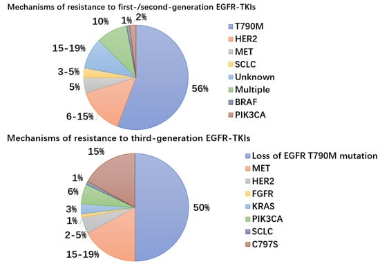 Mechanisms and frequency of resistance to EGFR-TKIs. MET gene amplification, PIK3CA gene mutations, bypass pathway activation, downstream pathway activation, EGFR modification mutations or amplification, and development of small cell lung cancer are examples of resistance mechanisms to EGFR-TKIs (SCLC). Third-generation EGFR-TKIs used as first-line therapy result in C797S mutations.
