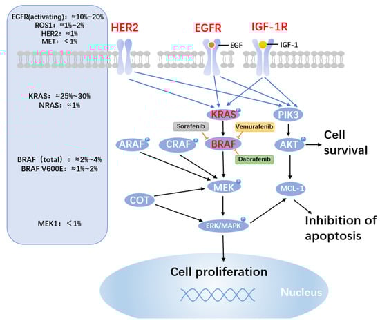 BRAF medication resistance mechanisms and mutation probability. BRAF mutations resulted in altered mitogen-activated protein kinase (MAPK) molecules. The approximate frequencies of frequent driver mutations discovered in the MAPK pathway in lung cancer are shown on the left side of the figure. BRAF valence at codon 600 (V600E) mutations, which cause native activation of BRAF, is only found in 1–2% of lung cancers. In patients with activating BRAF mutations, clinical study of BRAF alone or in combination with downstream MEK inhibition is continuing. On the right, prominent BRAF inhibitors are described. BRAF inhibitor resistance is conferred through cRAF, ARAF, the MAP kinase family member COT, and the pro-survival members of the BCL-2 family MCL-1. Despite BRAF inhibition, increased production of the alternative RAF isoforms (ARAP and CRAF) and MAP3K8/COT can still activate the MAPK pathway. The PI3K and MAPK pathways, which may offer paths around BRAF inhibition and apoptosis, also activate MCL-1.
