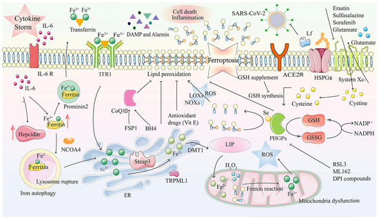 Ferroptosis and its mechanism in COVID-19. Ferroptosis is a kind of programmed cell death characterized by an imbalance in intracellular iron metabolism or a distortion of the glutathione peroxidation pathway. The transferrin receptor recognizes excess transferrin carrying Fe3+, and it enters cells through endocytosis after an SARS-CoV-2 infection. Metal reductase Steap3 reduces the Fe ions from trivalent to divalent, while the iron channels DMT1 and TRPML1 in the endosome membrane transport Fe2+ to the cytoplasm, which is accompanied by iron accumulation. In the case of intracellular iron overload, chemical substances in the mitochondrial electron transfer chain react with H2O2, Fe2+ and lipids, together, inducing the Fenton reaction, which produces large amounts of ROS. Due to GPX4 depletion and iron overload in LIP, lipid, nucleic acid and protein peroxidation results in cell membrane damage due to oxidative stress and ferroptosis. DAMPs and Alarmin (HMGB1, IL-33, TNF) are released, eventually aggravating cell death and inflammation. Tf and prominin 2 can effectively excrete the iron from the cells and inhibit ferroptosis. ACE2R, Angiotensin-converting enzyme 2 receptor; ALOXs, arachidonate lipoxygenases; BH4, tetrahydrobiopterin; CoQ10, coenzyme Q10; DAMP, damage-associated molecular patterns; DFO, deferoxamine; DMT1, divalent metal transporter 1; DPI, diphenyleneiodonium; ER, endoplasmic reticulum; FSP1, ferroptosis suppressor protein 1; GPX4, glutathione peroxidase 4; GSH, glutathione; GSSG, oxidized GSH; HMGB1, highmobilitygroupbox-1protein; HSPGs, heparan sulfate proteoglycans; H2O2, hydrogen peroxide; IL, interleukin; Lf, lactoferrin; LIP, labile iron pool; LOXs, lysyl oxidases; NADP+, nicotinamide adenine dinucleotide phosphate; NADPH, nicotinamide adenine dinucleotide phosphate; NCOA4, nuclear receptor coactivator 4; NOXs, NADPH oxidases; PLOOH, phospholipid hydroperoxide; PUFAs, polyunsaturated fatty acids; ROS, reactive oxygen species; RSL3, 1S,3R-RSL3; Se, selenocysteine; Steap3, six-transmembrane epithelial antigen of prostate 3; TFR1, transferrin receptors 1; TNF, tumor necrosis factor; TRPML1, transient receptor potential mucolipin 1; VitE, vitamin E. Reproduced from [49] (Sun C et al., 2020).