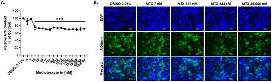 To determine adequate concentrations for MTX, HepaRGs were exposed to a wide range of MTX concentrations (4–120,000 nM) for 72 h, and the cell viability was evaluated by measuring the intracellular ATP content. The results demonstrated that MTX does not elicit a concentration-dependent decrease in viability. Exposure to 4 and 7 nM MTX elicited a 10% decrease in viability, whereas all the other concentrations resulted in a 15–23% decrease (Figure 1A). Concentrations of 7 nM, 117 nM, 234 nM, and 30,000 nM MTX were chosen for all subsequent experiments to ensure that the cell viability was always between 75% and 90%. Concomitantly to the decrease in cellular ATP levels, MTX led to an apparent reduction of the expression of albumin, assessed by immunohistochemistry (IHC) (Figure 1B and Figure S1).