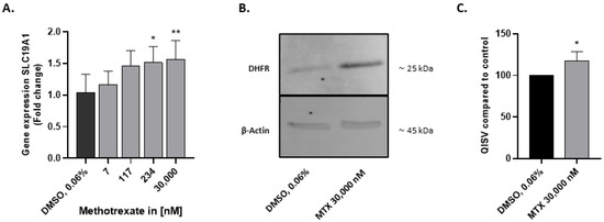 For the development of a suitable in vitro model to study MTX toxicity, we first verified the expression of the folate transporter SLC19A1 and the enzymatic target of MTX (DHFR) in HepaRG. Cells were exposed to a range of MTX concentrations for 3 days, and RNA was extracted for q-RT-PCR analysis. SLC19A1 was expressed in HepaRG, and its expression was slightly upregulated by the treatment (Figure 2A). To investigate DHFR expression, HepaRG were exposed to 30,000 nM MTX for 7 days, followed by a total protein extraction. DHFR was detected in the protein fraction by Western blot analysis (Figure 2B). Quantification of the detected bands revealed a higher abundance of DHFR in HepaRG exposed to MTX (Figure 2C).