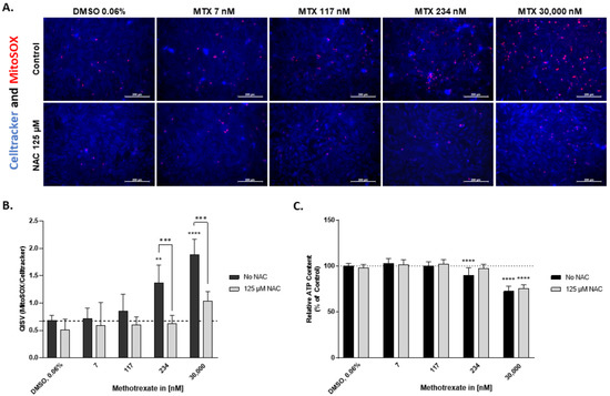 N-acetylcysteine (Sigma, Taufkirchen, Germany, A8199) was used as an antioxidant compound. A 2 h pre-incubation was carried out using 125 µM NAC at 37 °C in 5% CO2. Following the pre-incubation, the NAC treatment was refreshed and added with the MTX treatments and the untreated medium for a 72 h exposure period.