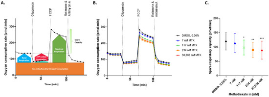 Measurement of the oxygen consumption rate in MTX-treated HepaRG. Mito Stress test profile (A). The oxygen consumption rate (OCR) of HepaRG exposed to MTX for 72 h was measured using the Seahorse XF96 analyzer (B). The HepaRG were sequentially exposed to three treatments: Oligomycin (1 μM), FCCP (2.5 μM), and a mix of Rotenone (0.5 μM) + Antimycin A (0.5 μM). OCR was measured 6 times per treatment step and expressed as pmol/min, N = 3 (B). Spare respiratory capacity was calculated for each condition as the difference from the basal to the maximal OCR (C). Graphs represent means (B) or means ± SD (C); statistical analysis based on one-way ANOVA; *, p ≤ 0.05; **, p ≤ 0.01; ***, p ≤ 0.001.
