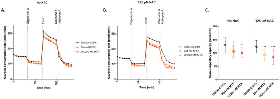 Effect of NAC on oxygen consumption rate in MTX treated HepaRG. The oxygen consumption rate (OCR) of HepaRG exposed to MTX for 72 h (A) or HepaRG preincubated with 125 μM NAC and then exposed to MTX for 72 h (B), was measured using the Seahorse XF96 analyzer. The HepaRG were sequentially exposed to three treatments: Oligomycin (1 μM), FCCP (2.5 μM), and a mix of Rotenone (0.5 μM) + Antimycin A (0.5 μM). OCR was measured 6 times per treatment step and expressed as pmol/min. Spare respiratory capacity was calculated as the delta maximal respiration to basal respiration (C). Graphs represent means (A,B), and means ± SD (C); statistical analysis based on two-way ANOVA; *, p ≤ 0.05; **, p ≤ 0.01; ***, p ≤ 0.001.; N = 3.