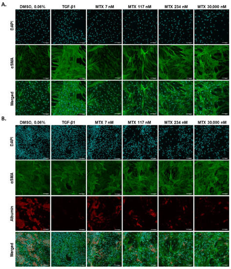 MTX triggers the activation of 2D hTERT-HSC in mono- and co-culture with HepaRG. Monocultures of 2D hTERT-HSC (A), or co-cultures with hTERT-HSC and HepaRG (B), were exposed to varying concentrations of MTX or the positive control TGF-β1 for 7 days. Cells were stained for stress marker αSMA (green), hepatocyte marker albumin (red), and counterstained with DAPI (blue). Scale bar representing 100 µm.