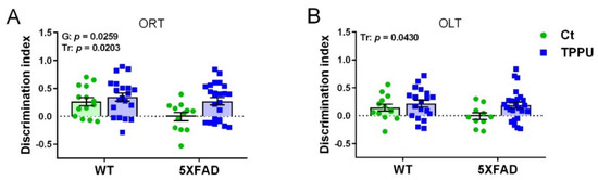 Cognitive testing in 2-month-old WT and 5XFAD mice from litters with maternal TPPU treatment or control (Ct). Breeding WT female mice were mated to 5XFAD male mice and dosed with 5 mg/kg/day of TPPU or vehicle during pregnancy and lactation. (A) Object recognition test (ORT); (B) object location test. Experimental maternal treatment: Ct (green circles), TPPU (blue squares); mouse genotype: WT (wild-type mice), 5XFAD (AD 5XFAD transgenic strain). Values are mean ± SEM of male and female mice ((A) n = 12−20; (B) n = 10−25). Statistics: two-way ANOVA. There was a significant effect of the treatment factor (Tr) in (A,B) and of genotype factor (G) in (B). p values of the significant factors are indicated in the corresponding graphs.