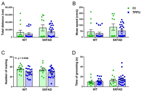 Male and female 5XFAD mice from control litters showed a tendency for higher exploratory activity than WT mice in the open field test (OFT). Horizontal activity is shown in Figure 2A,B. There was a borderline effect of the genotype factor in the total distance ambulated (p = 0.0603) and in the mean speed without rest intervals (p = 0.0530). However, 5XFAD offspring from TPPU-treated dams showed similar activity to WT mice, although the treatment factor did not reach significance. Therefore, these results suggested the presence of mild hyperactivity in young 5XFAD mice that was reduced by maternal TPPU treatment (Figure 2A,B). Vertical activity was significantly lowered by TPPU treatment in both WT and 5XFAD animals, as shown in Figure 2C. As a whole, a decrease in horizontal and vertical activities may indicate TPPU-induced changes in the exploratory pattern leading to lower excitability in a stressful environment. Finally, no changes were detected in grooming activity which discards the presence of stereotypic-like disorders, as shown in Figure 3D.