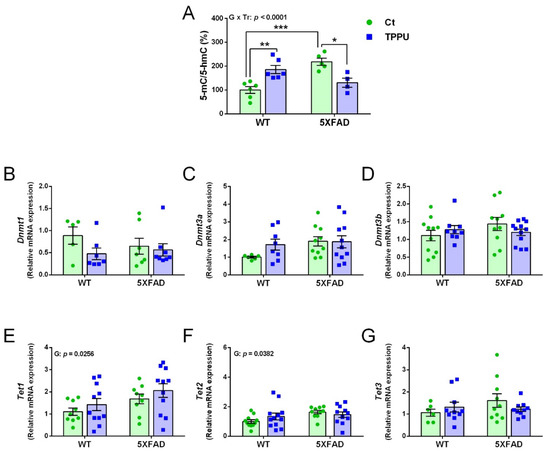 DNA methylation and demethylation changes in 2-month-old WT and 5XFAD mice from litters with maternal TPPU treatment or control (Ct). (A) Methylation profile obtained by the 5-methylcytosine (5-mC) and 5-hydroxymethylcytosine (5-hmC) ratio (%); (B–D) expression levels of the DNA methyltransferase genes Dnmt1(B), Dnmt3a (C), and Dnmt3b (D); (E–G) expression levels of the methylcytosine dioxygenase genes Tet1 (E), Tet2 (E), and Tet3 (G). (A–G) Cerebral cortex samples. Values are mean ± SEM of male and female mice ((A) n = 4–6; (B) n = 5–8; (C) n = 6–11; (D) n = 9–12; (E) n = 9–11; (F) n = 10–12; (G) n = 7–10). Statistics: ANOVA, interaction genotype per treatment effect (G x Tr) in (A), effect of genotype (G) in (E,F), p values of the significant factor and factor interaction are indicated in the corresponding graphs; Bonferroni post-hoc test after a significant factor interaction, * p < 0.05, ** p < 0.01, *** p < 0.001 between groups as indicated.