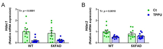 Histone deacetylation changes in the brain tissue of 2-month-old WT and 5XFAD mice from litters with maternal TPPU treatment or control (Ct). Expression levels of the histone deacetylase genes Hdac1 (A) and Hdac2 (B). (A,B) Hippocampus samples. Values are mean ± SEM of male and female mice ((A) n = 10–11; (B) n = 10–12. Statistics: ANOVA, effect of treatment (Tr) in (A,B), p values of the significant factor are indicated in the corresponding graphs.