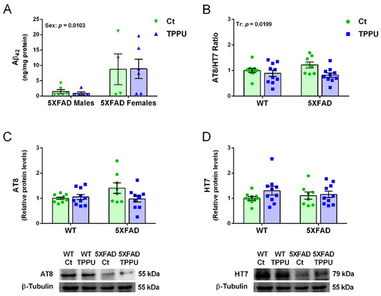Amyloid β42 (Aβ42) and hyperphosphorylated tau (p-tau) in 2-month-old 5XFAD mice from litters with maternal TPPU treatment or control (Ct). (A) Differential Aβ42 concentration in male and female 5XFAD mice; (B) ratio of protein levels of p-tau immunodetected by AT8 antibody (values shown in (C)) and total tau immunodetected by HT7 antibody (values shown in (D)) in WT and 5XFAD offspring. Representative blots are shown below the corresponding histograms in (C,D). (A) Cerebral cortex samples; (B–D) hippocampus samples. Values are mean ± SEM ((A) n = 4–6; (B–D) n = 8–10). Statistics: ANOVA, effect of sex (Sex) in (A) and treatment (Tr) in (B), p values of significant factors are indicated in the corresponding graphs; borderline interaction effect (G × Tr) in (C) (see text).