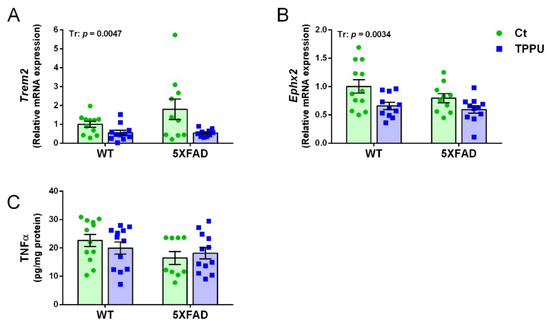Neuroinflammatory markers in 2-month-old 5XFAD mice from litters with maternal TPPU treatment or control (Ct). Expression levels of the genes Trem2 (A) and Ephx2 (B); (C) tumor necrosis factor α (TNFα) concentration (pg/mL). (A,B) Hippocampus samples; (C) cerebral cortex samples. Values are mean ± SEM ((A) n = 10–11; (B) n = 10–12; (C) n = 9–12). Statistics: ANOVA, effect of treatment (Tr) in (A,B), p values of the significant factor are indicated in the corresponding graphs.