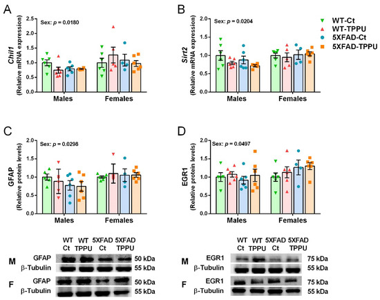Differential neurodegenerative markers in male and female 5XFAD mice. Expression levels of the genes Chil1 (A) and Sirt2 (B). Relative protein levels of glial fibrillary acidic protein (GFAP) (C) and early growth response 1 protein (EGR1) (D). Representative blots for males (M) and females (F) are shown below the corresponding histograms in (C,D). (A,B) Hippocampus samples; (C,D) cerebral cortex samples. Values are mean ± SEM ((A–D) n = 4–6). Statistics: ANOVA, effect of sex in (A–D), p values of the significant factor are indicated in the corresponding graphs. The Bonferroni post-hoc test was not significant in the comparison between specific experimental groups of males and females.