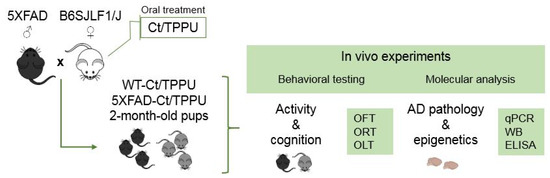 Male and female offspring at 2 months of age were used in this study. The total of 71 animals obtained from the control or TPPU-treated dams were distributed into the corresponding experimental groups as follows: WT Control (WT-Ct), n = 7 males and n = 7 females; WT TPPU (WT-TPPU), n = 10 males and n = 10 females; 5XFAD Control (5XFAD-Ct), n = 7 males and n = 5 females; 5XFAD TPPU (5XFAD-TPPU), n = 13 males and n = 12 females. All of the mice were submitted to behavioral testing and then euthanized to obtain brain tissue for molecular analysis. A scheme of the experimental design is shown in Figure 8.
