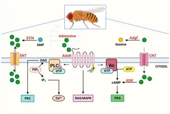 | Adenosine | Synergistic signaling of AdoR, Ent2, Adgf-A | [37] |