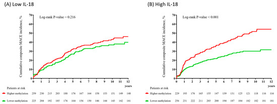Cumulative incidence (%) of composite major adverse cardiac events (MACEs) according to the average BDNF methylation at baseline in patients with low (A) and high (B) interleukin-18 (IL-18) levels.