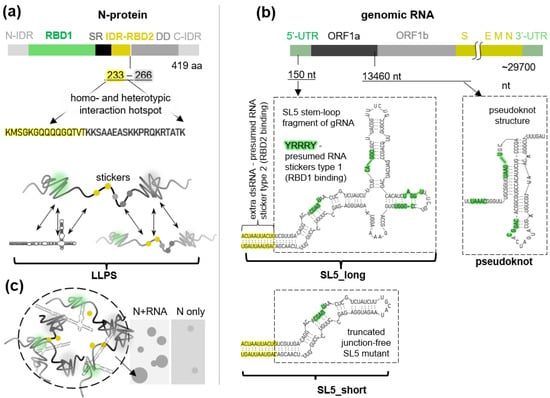N protein contains two structured domains, namely the N-terminal RNA binding domain (RBD1) and the C-terminal dimerization domain (DD), flanked by three intrinsically disordered regions (IDRs) (Figure 1a). As was evidenced by the cross-linking mass spectrometry assays, the Ser/Arg-rich (SR) region-adjoining RNA-binding part of the central IDR (RBD2) and the neighboring part of the DD form a particularly large number of homo/heterotypic contacts upon N-gRNA condensation [4,5]. They contain multiple Arg and Lys residues (presumed stickers) interspersed with non-charged amino acids (presumed spacers) and are recognized as essential for LLPS [4,5]. In viral gRNA, two types of stickers have been identified recently. These are dsRNA stretches and YRRRY motifs, where R is a purine nucleotide, and Y is a pyrimidine nucleotide [7,8] (Figure 1b).