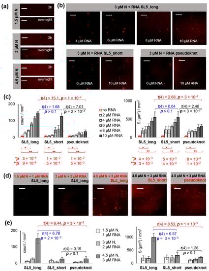 For further analysis, we selected the SL5_long:N ratio equal to 2:1 (6 µM RNA and 3 µM N) because it ensured noticeable droplet formation, while PC remained equal to 10 ± 3. This N:RNA ratio (1 N protein molecule per ~80 nt) is lower than that used previously (~3 N molecules per nt [7]) but very close to that expected in cells (1 N per ~70 nt, assuming a single RNA copy and 38 RNPs, ~12 N molecules each, per virion [10]).