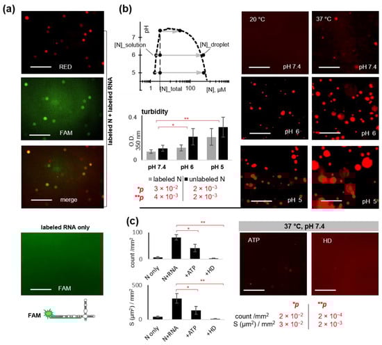 At a physiological salt concentration (150 mM) and pH values in the range of 5–7.4, N-RNA mixtures showed increasing LLPS with decreasing pH. In the weakly acidic media, the condensates became apparent even after a relatively short (2 h) incubation at both 20 °C and 37 °C (Figure 3b). Incubation overnight gave similar results, except for the minor droplet flocculation, which agrees with previous observations [21,22]. This trend, revealed by fluorescence microscopy, was additionally confirmed by turbidity assays (Figure 3b). We attribute the effect of pH to partial deprotonation of the positively charged N protein, which increases the surface tension and promotes the hydrophobicity-driven separation.
