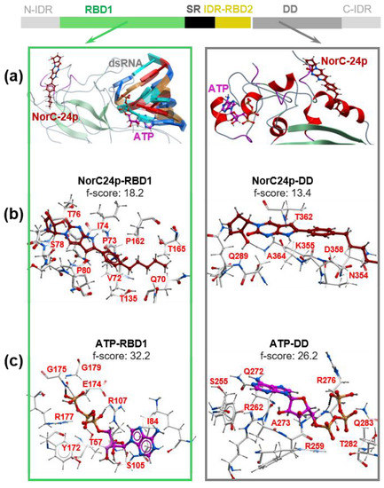 Molecular modeling of NorC-24p and ATP interactions with N protein. (a) Key binding sites revealed by docking of NorC-24p and ATP to N-protein RBD1 and DD. (b) Best-scoring conformations of NorC-24p complexes with N and respective scoring functions. (c) Best-scoring conformations of ATP complexes with N and respective scoring functions.