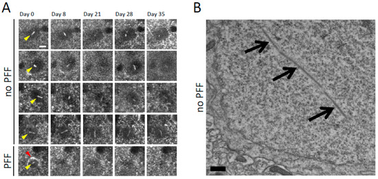 Intranuclear alpha-synuclein-GFP rod-like aggregates form spontaneously in transgenic mouse cortical neurons and in neurons bearing somatic Lewy pathology after PFF injection. (A) Top rows: In vivo multiphoton imaging performed serially over 5 weeks shows four different examples (each row a different cell) of mouse cortical neurons in Syn-GFP transgenic animals bearing intranuclear Syn-GFP rod-like aggregates (yellow arrowheads). Intranuclear aggregates are mobile within the nucleus at this time scale, changing orientation within the nucleus over the course of days. Bottom row: In vivo imaging from a cortical neuron bearing a somatic Syn-GFP Lewy inclusion (red arrowhead) induced by alpha-synuclein PFF injection, also with an intranuclear aggregate (yellow arrowhead), on day 0 of imaging, which degenerates and disappears before day 8. Scale bar: 5 μm. (B) Electron micrograph of cortical neuron in Syn-GFP transgenic animal (with no PFF injection) demonstrating a rod-like intranuclear aggregate (arrows). Scale bar: 500 nm.