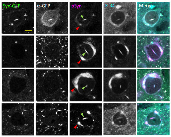 To better understand the molecular properties of NNIs, we stained both Syn-GFP-positive and -negative inclusions in fixed tissue with an antibody to GFP to confirm that the endogenous Syn-GFP signal colocalized with the anti-GFP antibody staining as expected (Figure 3). All inclusions, both Syn-GFP positive and negative, stained positive for the Lewy pathology marker pSyn (Figure 3). In addition, we stained fixed tissue with the small molecule dye X-34, a derivative of Congo red, which labels fibrils with a cross beta-pleated sheet structure and stains aSyn aggregates with a higher signal-to-noise ratio than thioflavin S in our mouse model [10,35]. This dye selectively binds a molecular structure where the direction of the beta-pleated sheet is perpendicular to the long axis of the fibril, also known as an amyloid conformation. This amyloid conformation is typical of aSyn in Lewy pathology. Like the cytoplasmic Lewy pathology within the same cell, NNIs are also labeled by X-34 (Figure 3). This pattern of NNIs staining positive for both pSyn and X-34 indicates that NNIs in this model share several of the important molecular properties of aggregated aSyn found within human Lewy pathology.