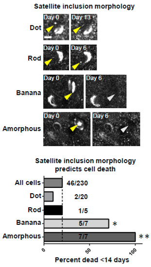 Development of specific intranuclear aggregate morphologies predicts imminent cell death. Top: Examples of specific intranuclear aggregate morphologies (dot, rod, banana, and amorphous). Scale bar: 5 μm. Bottom: Group data showing predictive value for the development of intranuclear inclusions with different morphologies in predicting cell death within the next 14 days compared to the frequency expected from “all cells”, which includes those with and without intranuclear inclusions (dotted line). The first value to the right of each column represents the number of cells that died within 14 days in that category, and the second number represents the total number of cells detected in that category. The probability of observing this number of cell death events by chance using the binomial distribution predicted p-values * < 0.005 for “banana” and ** <0.0001 for “amorphous” inclusions.