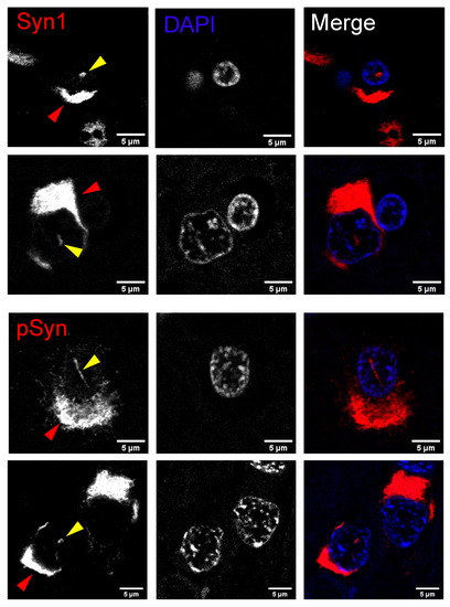 - Jiang, P.; Gan, M.; Yen, S.H.; Moussaud, S.; McLean, P.J.; Dickson, D.W. Proaggregant nuclear factor(s) trigger rapid formation of alpha-synuclein aggregates in apoptotic neurons. Acta Neuropathol. 2016, 132, 77–91. [Google Scholar] [CrossRef] [PubMed]