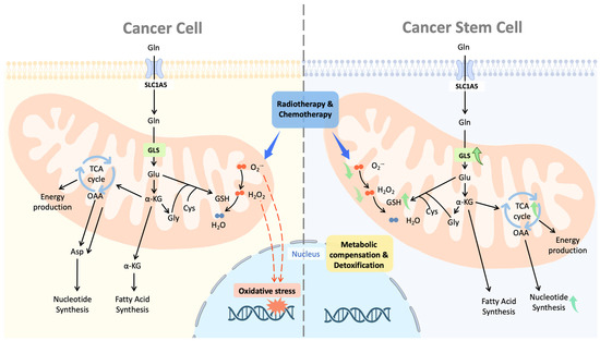 CSC metabolic features have been the subject of intense research with the goal of elucidating the mechanisms underlying their aggressive behavior and stemness traits. Upregulated features of glutaminolysis have been demonstrated in multiple lines of CSCs, including pancreatic, lung, ovarian, cervical, prostate, and hepatocellular cancers, suggesting their reliance on glutamine metabolism and potential sensitivity to anti-glutaminolysis therapies [118,119,120,121,122].