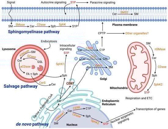 Sphingolipid metabolism is extremely complex and is regulated by the activity of more than 40 enzymes [10]. Ceramide is the core of sphingolipid metabolism and can be produced or utilized through several pathways. There are three main synthesis pathways of ceramide: the de novo pathway, the sphingomyelinase (SMase) pathway (or catabolic pathway), and the salvage pathway (Figure 1).