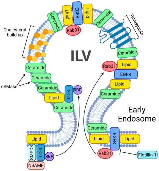 ESCRT-independent pathway of exosome biogenesis and release. A crucial step in starting the ESCRT-independent exosome biogenesis is the phosphorylation of Rab31. A phosphorylated Rab31 will allow flotillins to deliver the EGFRs into the ILV. nSMases will help accumulate ceramides inside the ILVs. In addition, such ILVs will be enriched in ceramides and cholesterol. Another mechanism of lipid buildup inside the ILV involves LC3, which also incorporates RNA binding sites and small non-coding RNAs.