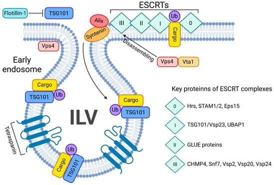 ESCRT-dependent pathway of exosome biogenesis and release. The ESCRT-dependent exosome biogenesis starts with assembling all 4 ESCRT complexes on the ubiquitin-bound cargo (Ub-cargo). The process is tightly regulated by key proteins such as Alix and syntenin. Once ESCRTs bind the Ub-cargo, TSG101 navigates the cargo inside the ILV and the Vsp4/Vta1 complex will disassemble the ESCRT 0-III complex. Tetraspanins will favour the budding of the ILV.