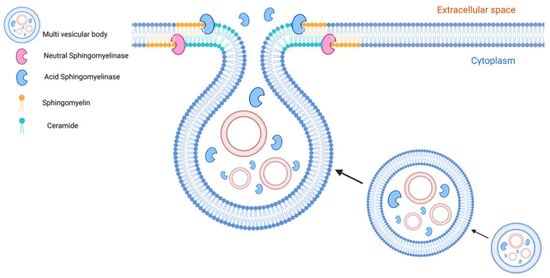 The acid sphingomyelinase (aSMase) is also involved in EV formation and release. The acidic enzyme can move onto the cell surface via direct translocation or lysosomal exocytosis in response to stimuli such as CD95 or Pseudomonas aeruginosa infection as well as in wounded cells [89,90,91]. Bianco and colleagues demonstrated that aSMase activity triggers MVs release from glial cells, a process which requires p38 MAPK activation [92]. SMase has been shown to be associated with membrane lipid raft microdomains and its activity results in localized ceramide build-up, thereby creating ceramide-enriched microdomains and inducing membrane curvature [20,28]. In trophoblast cells, alteration of membrane curvature facilitates the budding from the inner plasma membrane to form early endosomes that, when cholesterol-rich, promotes endosome transport for secretion via the MVB pathway for the secretion of EVs [91]. Interestingly, other enzymes of the sphingolipid metabolism such as SMS1 and SMS2 could finely regulate EV formation. The inhibition or silencing of these two enzymes, respectively, lead to the accumulation of ceramide in the trans-Golgi and plasma membrane increasing the release of EVs by microglia cells [93].